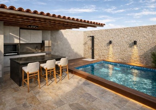 A solução foi readequar o projeto dentro da fundação já executada, otimizando o espaço e ajustando a planta para atender às novas exigências da cliente. A banheira de hidro foi inserida no ambiente planejado, e a área gourmet foi integrada à piscina nos fundos, garantindo um layout harmônico e funcional.